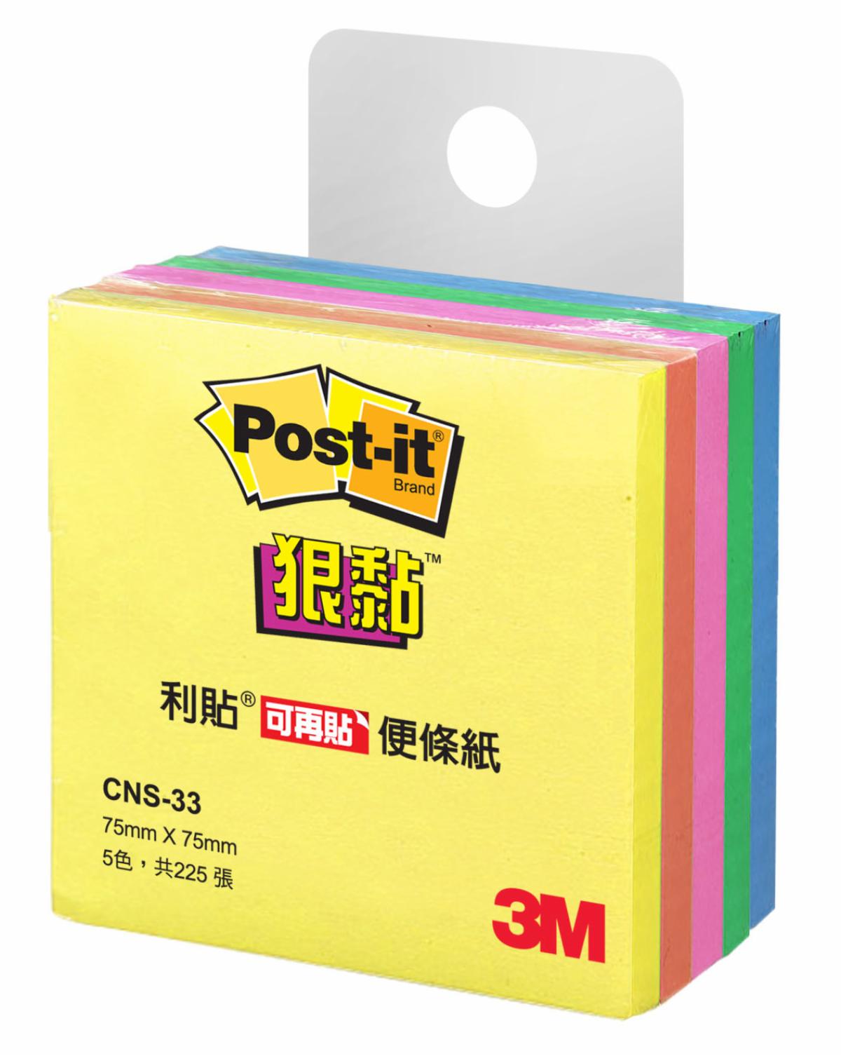 3M™ Post-it® 利貼® 狠黏™ 便條紙 CNS-33, 五色, 75公釐 x 75公釐, 45張/本, 5本/盒